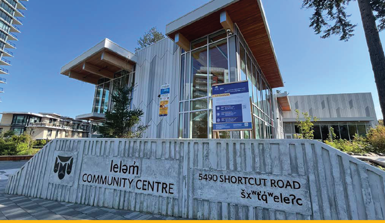 The leləm̓ Community Centre, located at 5490 Shortcut Road, is a 15,000 ft2, two-level community centre located in leləm̓ Village, within the University Endowment Lands. Delivered by Musqueam Capital Corp (MCC), the community centre was built with a focus on sustainability and accessibility, using LEED® Gold standards. The community centre incorporates Indigenous artwork throughout the façade and building interior, celebrating the rich culture of Musqueam and the natural beauty of the Pacific Northwest.